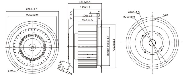 ①技術(shù)參數(shù):風(fēng)輪直徑為225mm,由4極和6極額定電壓為230/400V,頻率50Hz,分單相電容運(yùn)轉(zhuǎn)和三相異步運(yùn)轉(zhuǎn)電機(jī)組成,可提供1800m3/h和1300m3/h的風(fēng)量要求。