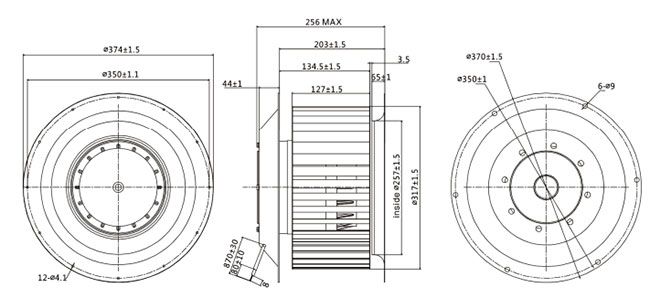單進(jìn)風(fēng)前傾式離心風(fēng)機(jī)根據(jù)風(fēng)機(jī)外形可分為蝸殼前傾式離心風(fēng)機(jī)和常規(guī)前傾式離心風(fēng)機(jī)兩種。蝸殼前傾式離心風(fēng)機(jī)共有120mm、133mm、140mm、150mm、160mm、180mm等六種。常規(guī)前傾式離心風(fēng)機(jī)有200mm、225mm、250mm、280mm、315mm、355mm、400mm、450mm等八種。