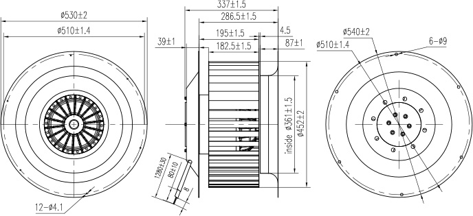 單進(jìn)風(fēng)前傾式離心風(fēng)機(jī)根據(jù)風(fēng)機(jī)外形可分為蝸殼前傾式離心風(fēng)機(jī)和常規(guī)前傾式離心風(fēng)機(jī)兩種。蝸殼前傾式離心風(fēng)機(jī)共有120mm、133mm、140mm、150mm、160mm、180mm等六種。常規(guī)前傾式離心風(fēng)機(jī)有200mm、225mm、250mm、280mm、315mm、355mm、400mm、450mm等八種。